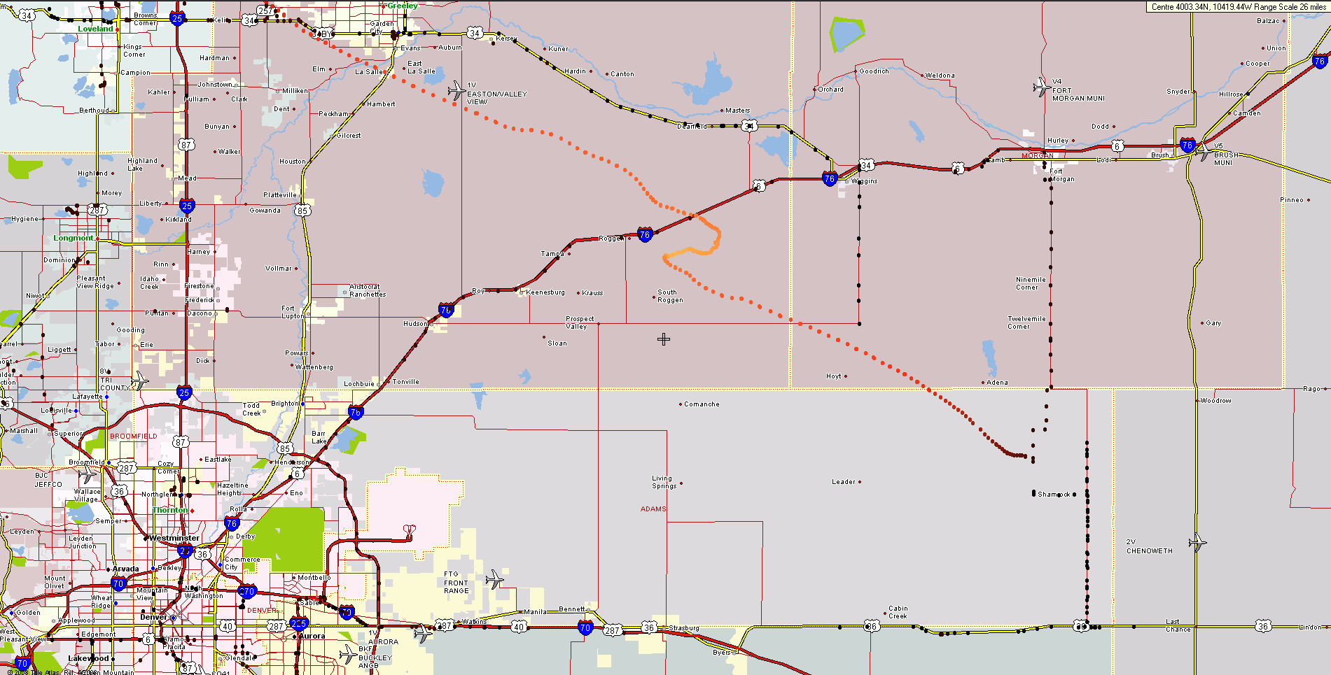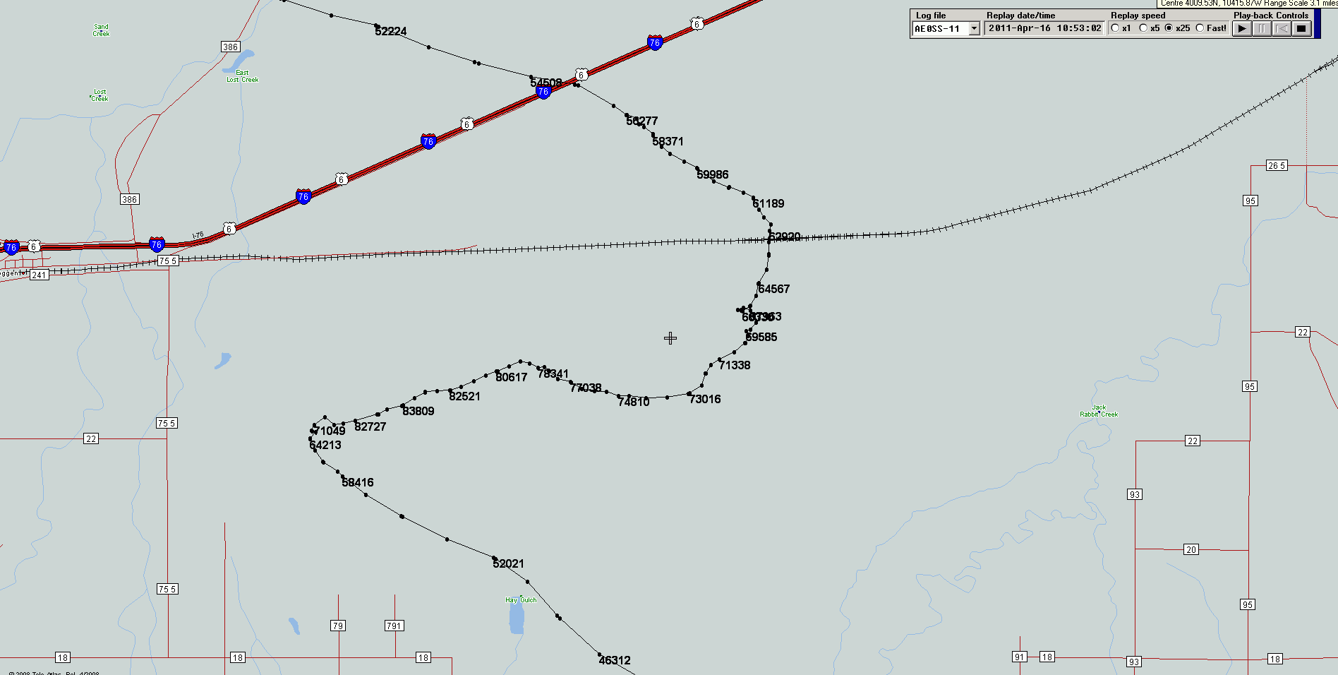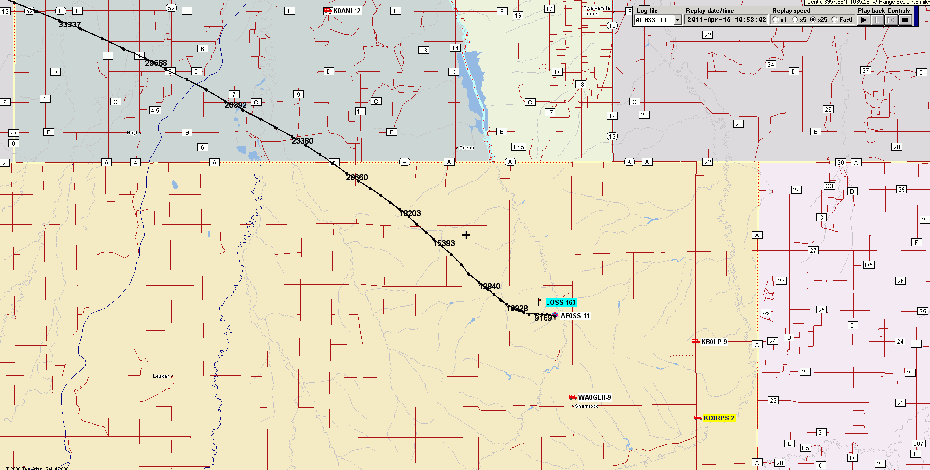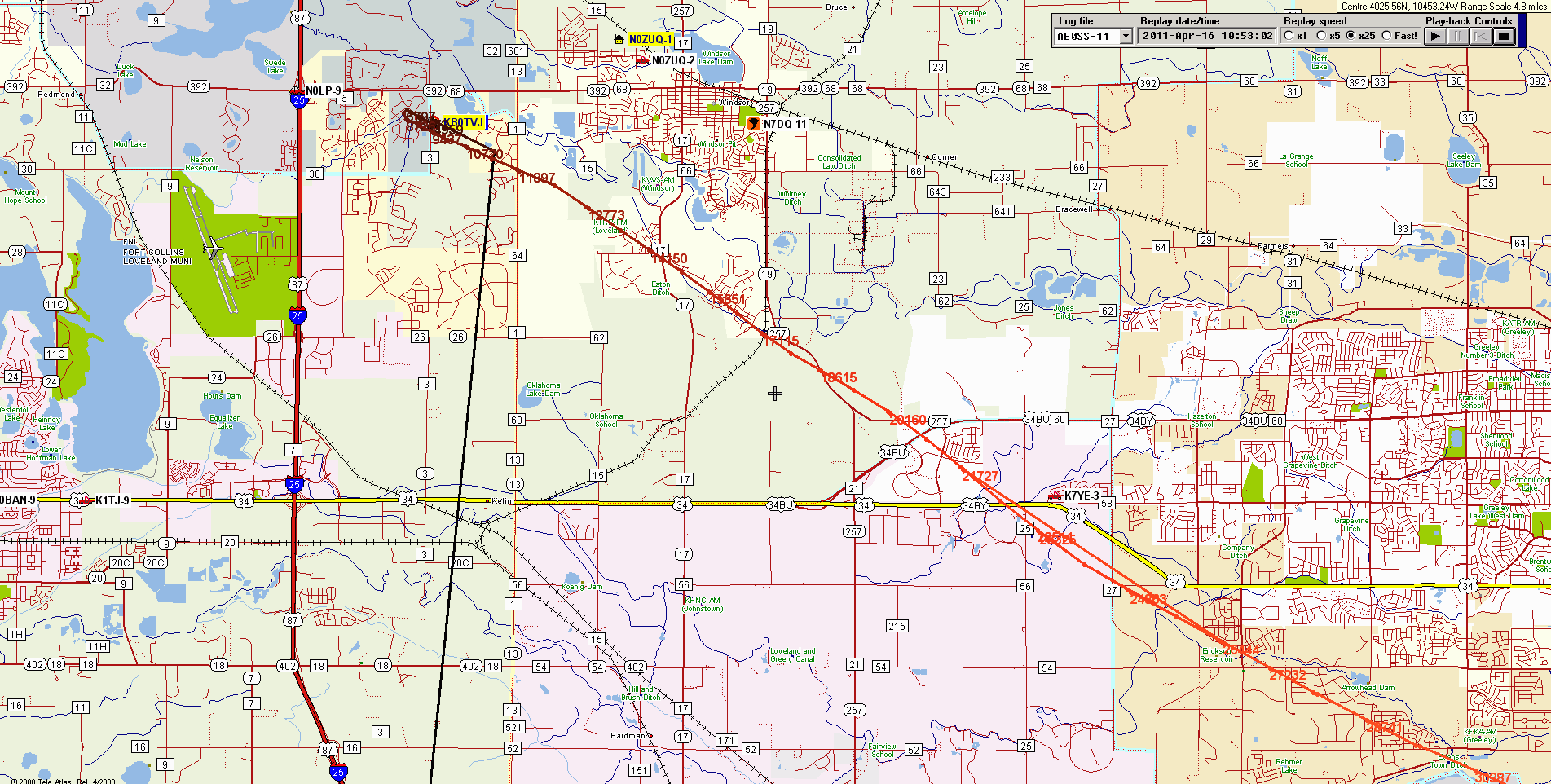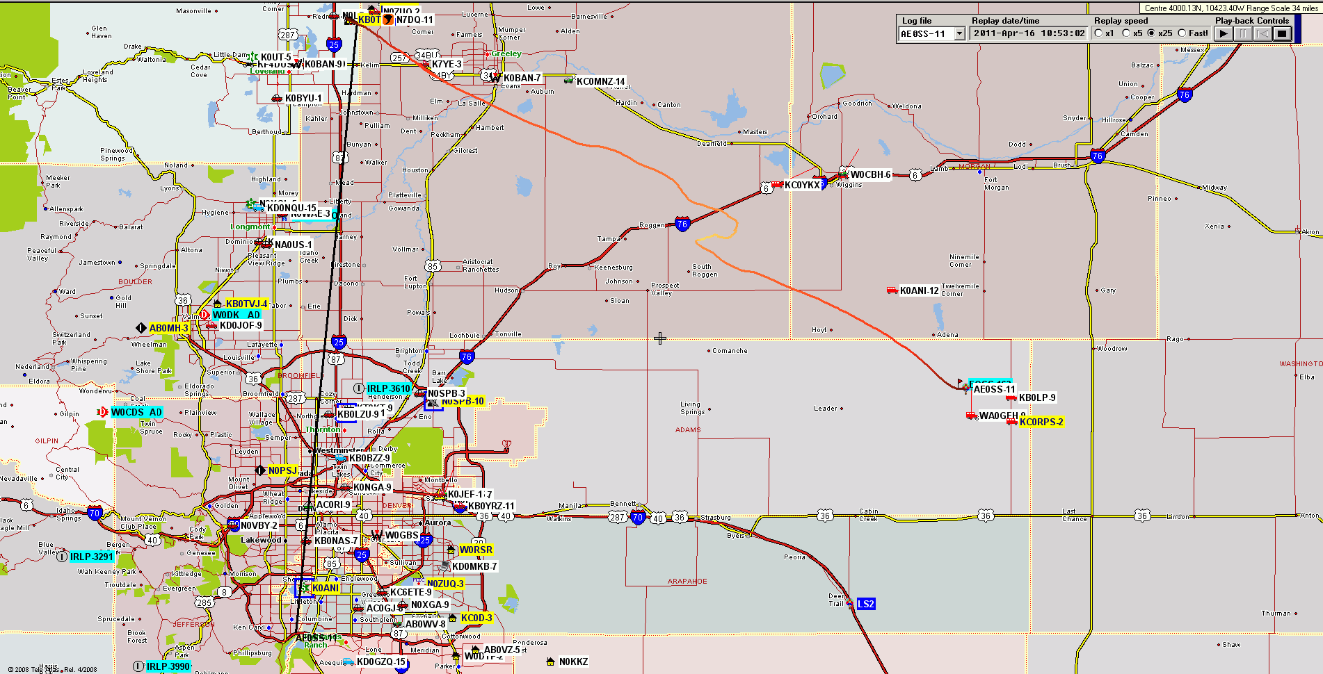 Note odd hiccup with AE0SS-11 showing start point on the south side of Denver metro area. I assume the GPS or TNC must have cached a previous position report that got transmitted when the unit was first fired up at the launch site. See detailed closeup of the launch for more detail.