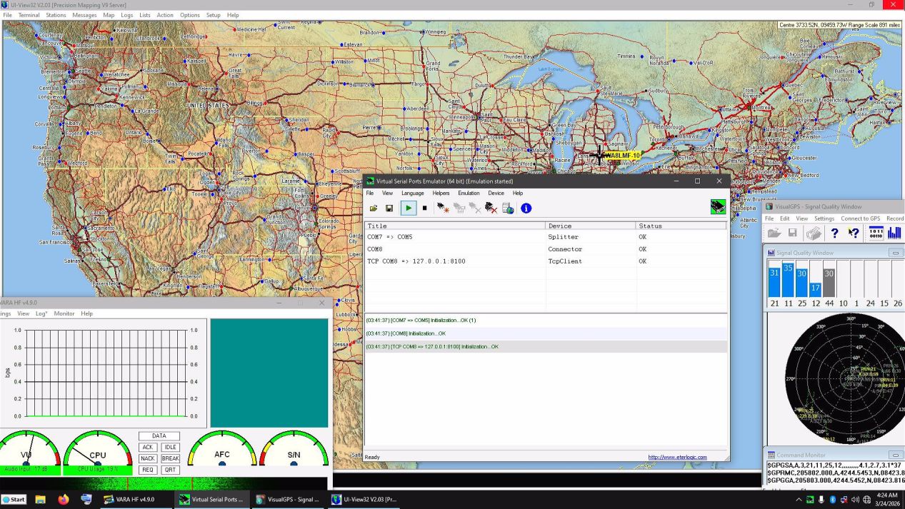 In the center, "VSPE" (Virtual Serial Ports Emulator) is showing. This program translates the KISS-over-IP output of VARA to the KISS-over-serial-port format required by UIview. VSPE also splits the GPS data received over USB on a virtual COM7 to multiple outputs on COM5 to provide GPS data to both "UIview" and "Visual GPS" at the same time. Normally, this program is hidden behind the UIview map.
