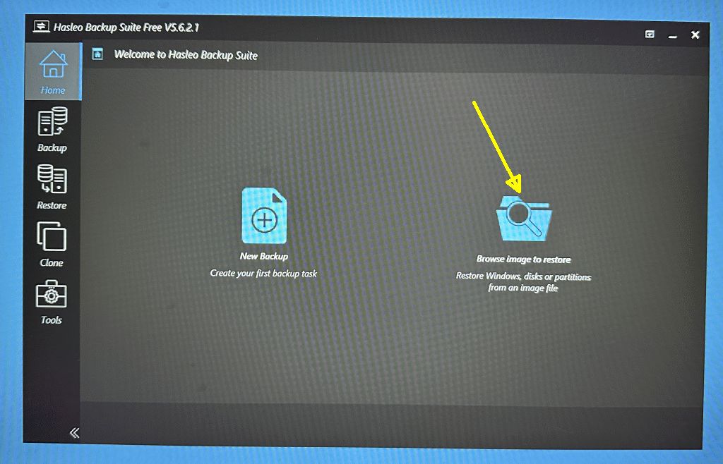 Select the final choice in the top line to "Save and Exit" . The PC will reboot, this time starting from the flash drive. If your flash drive has some sort of activity indicator LED on it, it will flash constantly as Windows PE and then the Hasleo utilities load. BE PATIENT -- This process will take about 4 minutes. Ultimately the Hasleo home screen will appear.