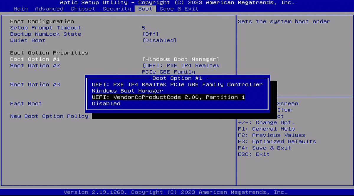 [Note that this override of the default boot sequence DOES NOT stick. The boot sequence resets to default (internal drive first) every time the power is cycled off and back on.]