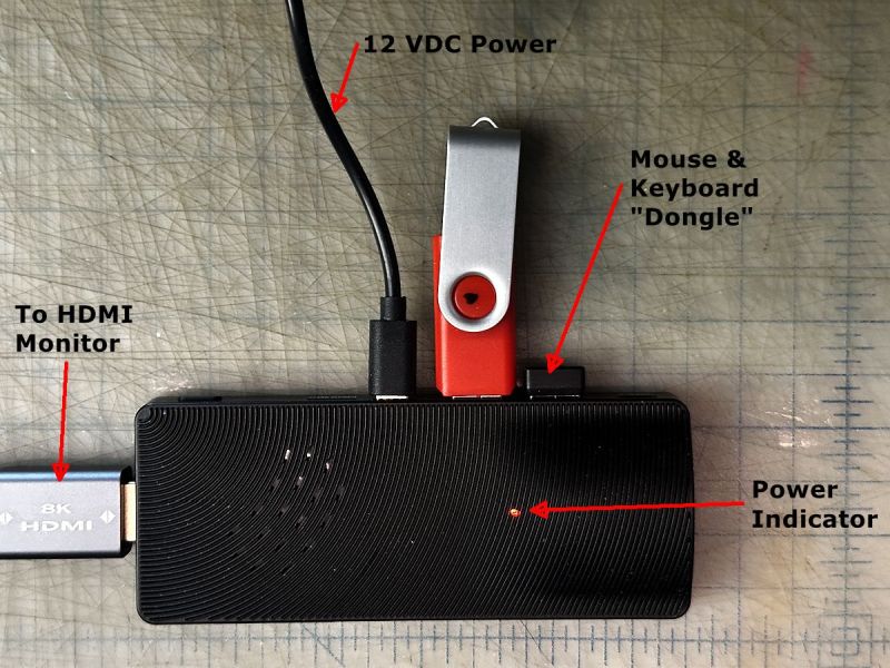 Initially, to set up the device, plug the USB receiver "dongle" of a wireless mouse/keyboard set into one of the USB ports. Plug the HDMI connector into a HDMI port on a digital TV or monitor. Insert the flash drive into one of the USB ports. When first connected to 12VDC power, the Power Indicator LED will be red. Press and hold the power button several seconds until the LED turns blue.