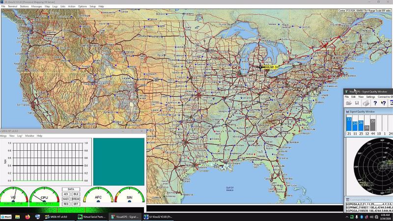 Depending on the USB GPS used, it may randomly be assigned a COM port # other than COM7, and thus not be seen by the VSPE com-port splitter. If so, use the Windows Device Manager (convenient direct shortcut provided at the upper-left corner of the desktop) to reassign the GPS com-port number to COM7