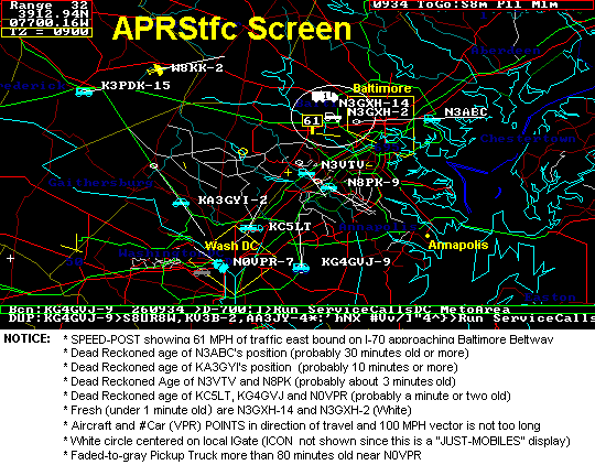 SUMMARY: APRStfc.exe is a version of APRSdos with a very simple method for reporting traffic speeds to local mobiles and commuters. Only one copy of APRStfc needs to be running in a local metro area to serve all the local users and SPEED-POSTS for that area. Here is what they see: