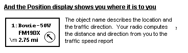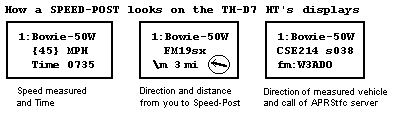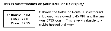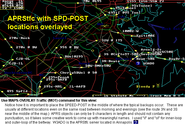 SPEED-POSTS: Notice that the name of the SIGN-POST OBJECT is the physical name of where the post is located (as shown on a Kenwood, but NOT on the map). For example our biggest commuter choke point is Route 50 in Bowie. So the SIGN-POST for that location might be "Bowie-50W" (meaning west-bound) then the commuter simply looks through his Kenwood station list for the SIGN-POST name along his commuting route and clicks on it and boom... he sees the data... Just what APRS was designed to do... Or if someone else asks about traffic in some other area, an APRS mobile can find the info on his radio and report by voice.
