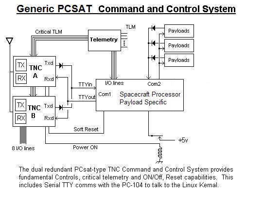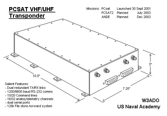 The PCsat type VHF/UHF transponder has proven to be a very reliable command and control link on PCsat and has been designed into our other ANDE and PCSAT2 projects. The following image describes a stand-alone packaged version of the PCSAT transponder. All it needs are the two VHF and UHF whip antennas.